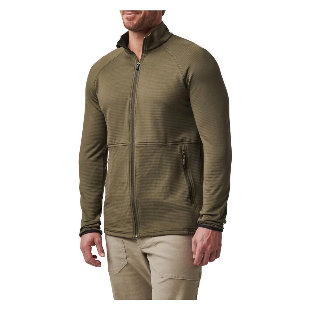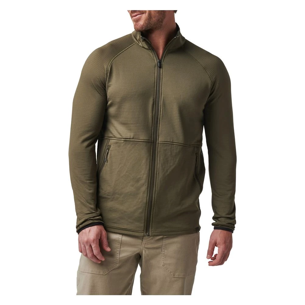 One-way center front zipper with internal chin guard | Brushed tricot lined inner collar | Raglan sleeves with elastic binding cuffs | Hand zipper pockets with dipped cord pullers | Main label / tag-less heat transfer | 5.11 [+] flag label at wearer’s left hem | 91% polyester/ 9% elastane grid fleece, 6.1-oz., wicking and anti-odor finish