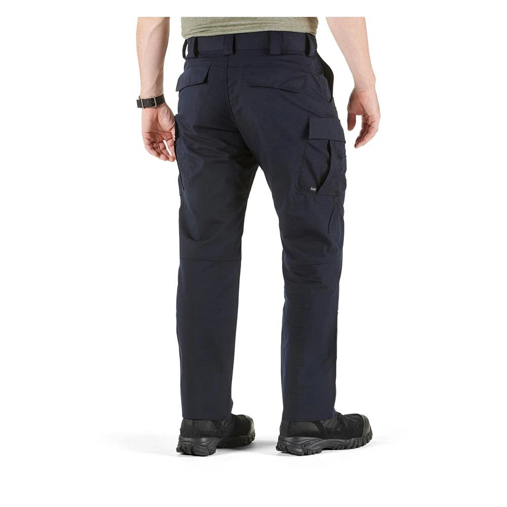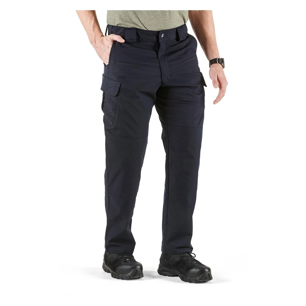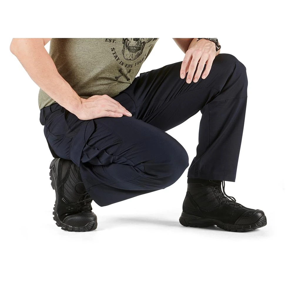 The 5.11 Stryke pants sport a crisp, professional appearance with plenty of hidden functionality. The front hip pockets are designed to fit a knife or a cell phone while the double-deep, double-reinforced angled cargo pockets provide plenty of secure storage space. For on-duty use, the pants feature badge holders on both left and right front belt loops and internal knee-pad pockets. In order to maintain maximum mobility, these pants feature 5.11’s proprietary Flex-Tac fabric, a stretchy polyester / cotton fabric blend that still holds up tough. Articulated knees, a tunneled elastic waistband and gusseted crotch also contribute to extreme freedom of movement. To top it off, the entire garment is coated with a Teflon treatment that repels water and increases stain resistance.